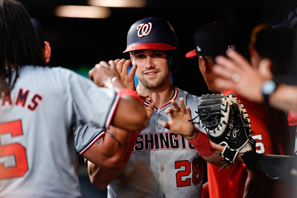 Jun 21, 2024; Denver, Colorado, USA; Washington Nationals right fielder Lane Thomas (28) celebrates in the dugout after scoring on an RBI in the fourth inning against the Colorado Rockies at Coors Field. Mandatory Credit: Isaiah J. Downing-USA TODAY SportsBetMGM and Caesars Sportsbook will offer district-wide online sports betting next weekThe latest Washington, D.C. budget allows for the expansion of online sports betting operatorsDraftKings, Fanatics have both expressed interest in joining the Washington, D.C. market